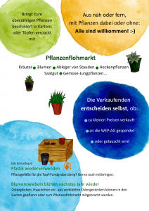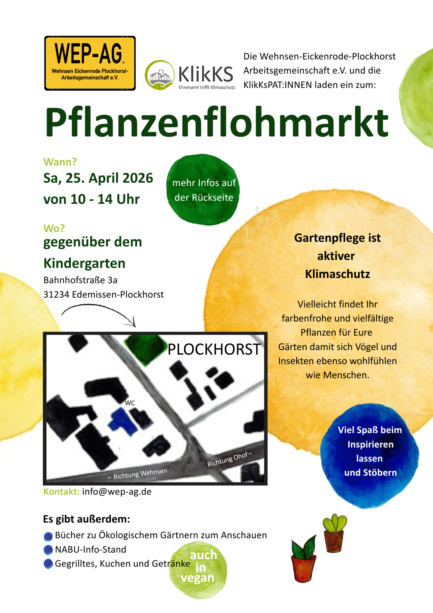Wir laden zum wieder zum Pflanzenflohmarkt der WEP-AG (Wehnsen Eickenrode Plockhorst-Arbeitsgemeinschaft e.V.) ein. Da es in diesem Jahr der einzige Pflanzenflohmarkt in der Gemeinde Edemissen ist, freuen wir uns besonders über die Unterstützung der NABU Ortsgruppe Edemissen, die mit einem Infostand vertreten sein wird.